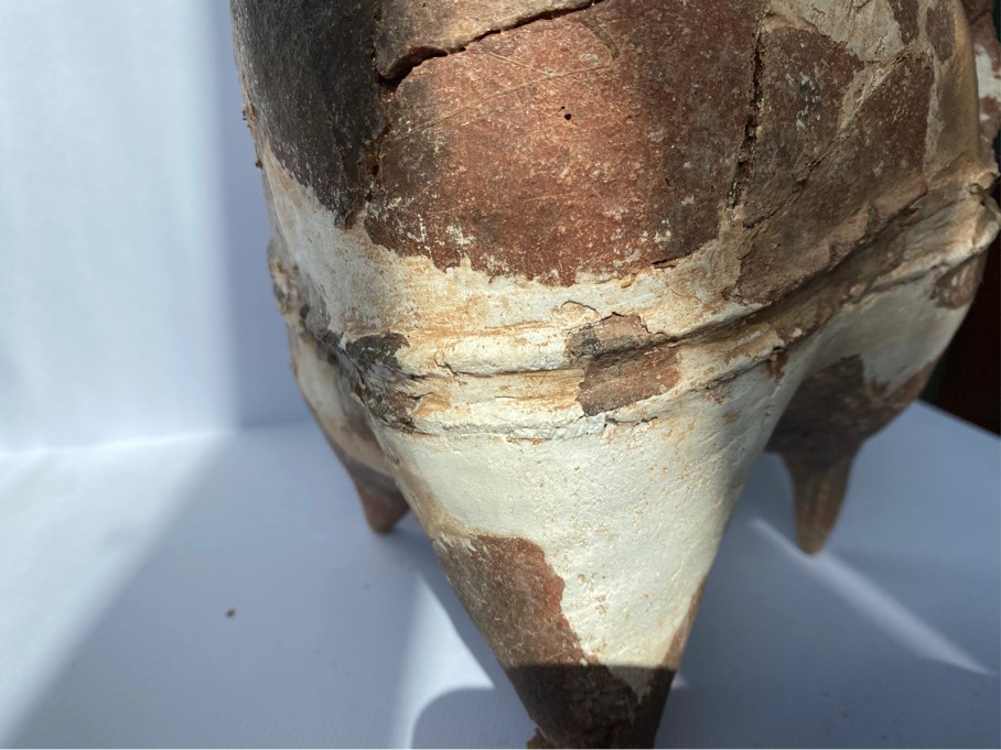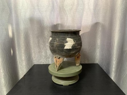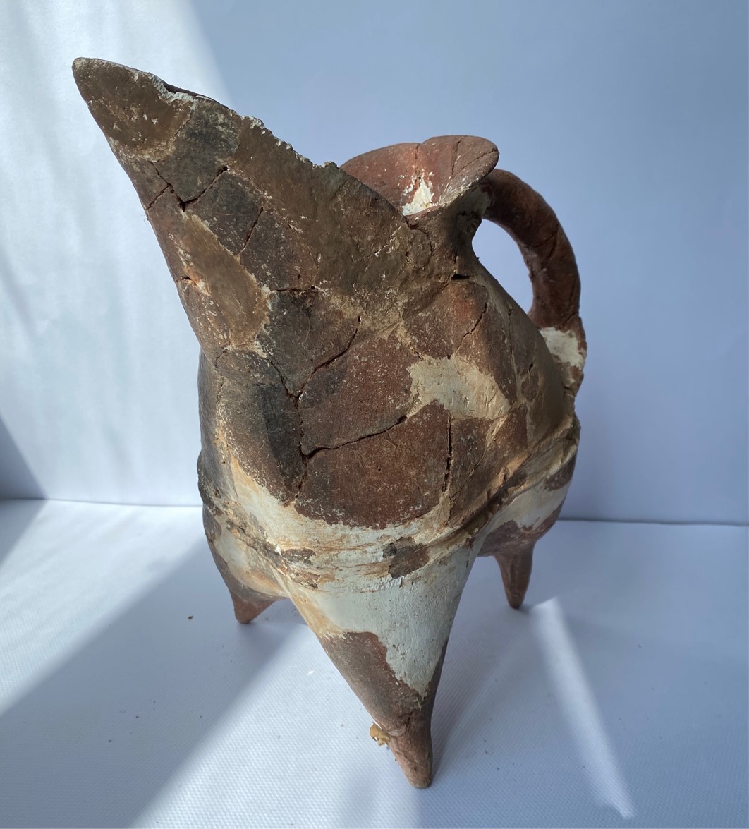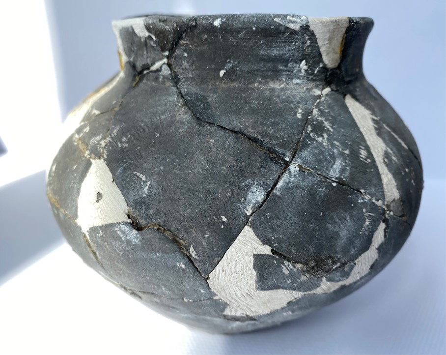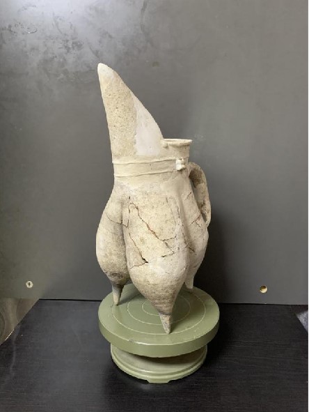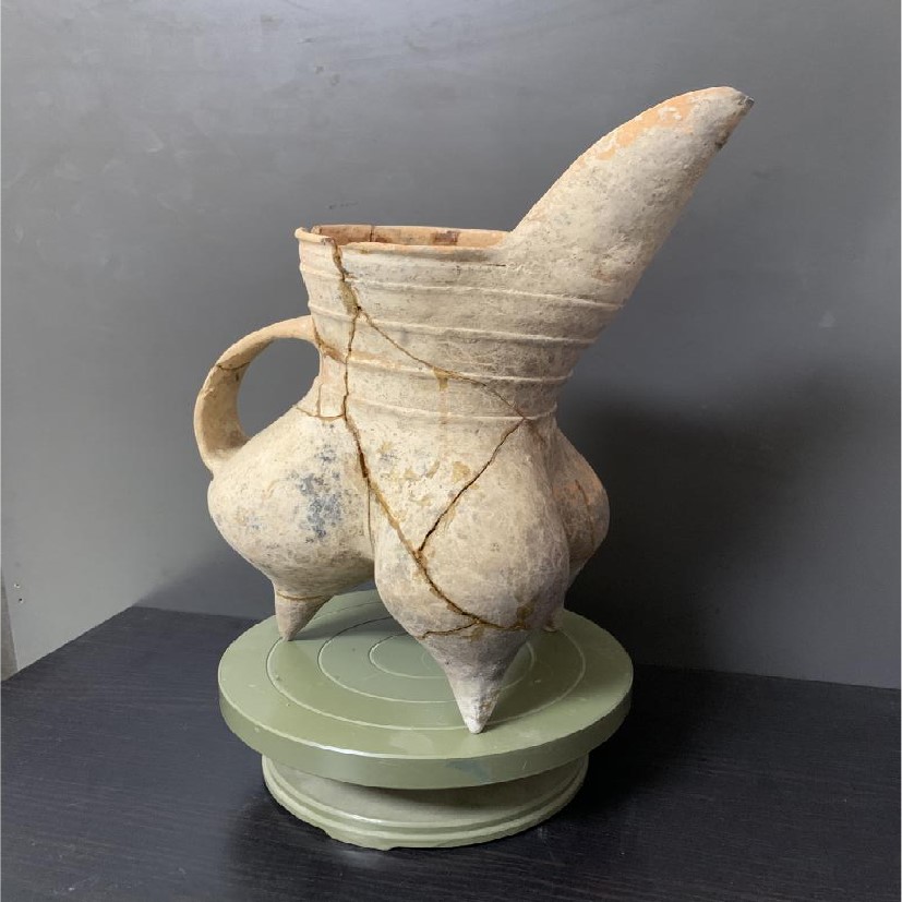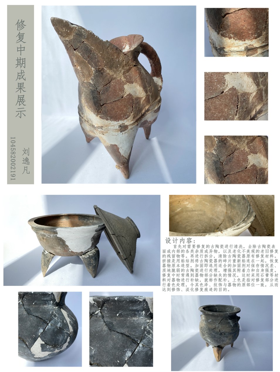 创作说明:对已损陶器进行文物修复,进而更好的展现陶器自身赋有的价值。陶器的修复主要包括清除沉积物污垢,陶器清洗,碎片预拼接,粘接,补全,以及封户等工序。修复材料及工具主要包括蒸馏水、乙醇、脱脂棉、纸胶带、手术刀、B72、丙酮等。陶器的粘接是将分组拼接成的残片再次组合拼接成整器的过程。陶器的补全遵循文物修复的兼容性原则。陶器与石膏相似相容,因此选用石膏进行补配,调配时往石膏中加入乳胶是为了增加石膏的的粘合度。给后期打磨留有一定的加工余地,待石膏固化后,将其打磨光滑。