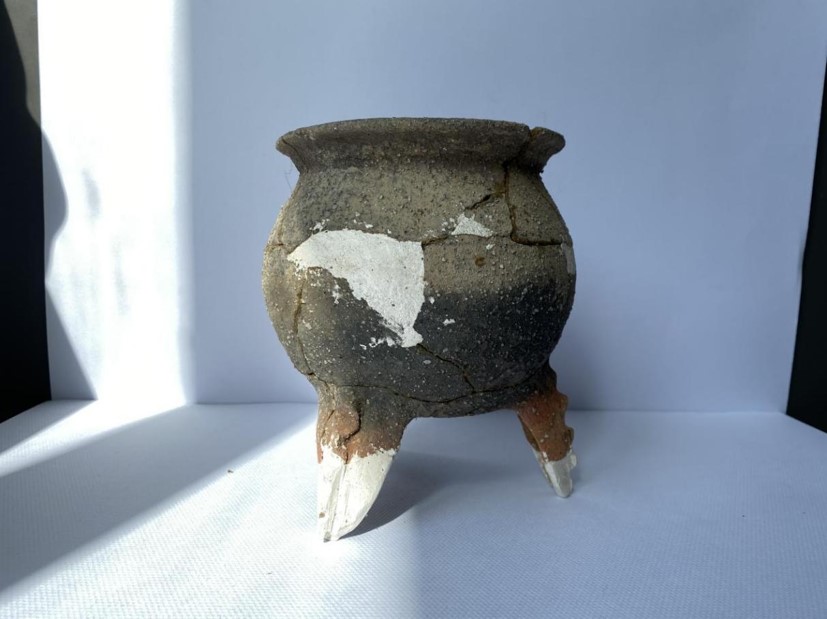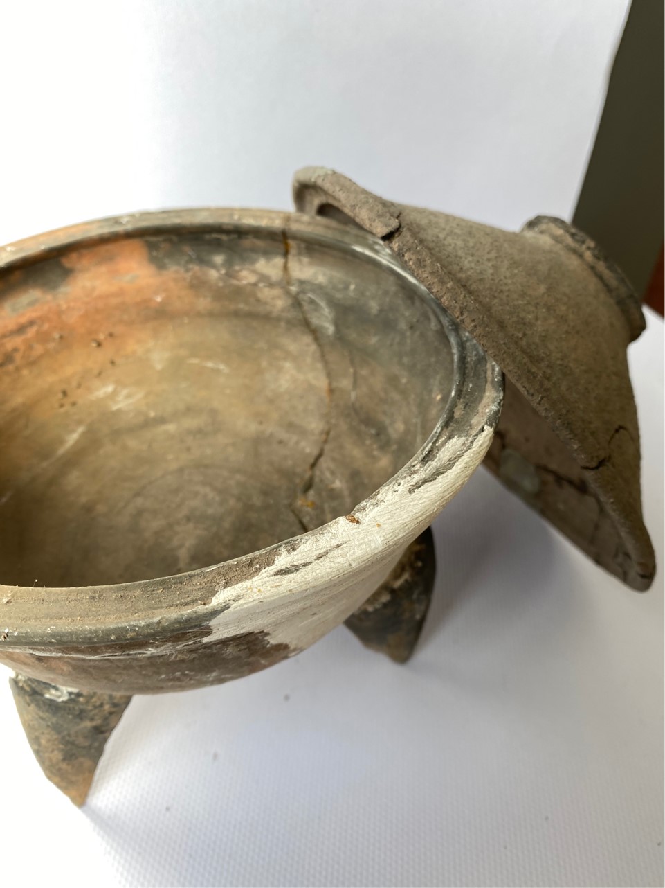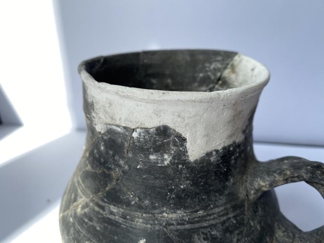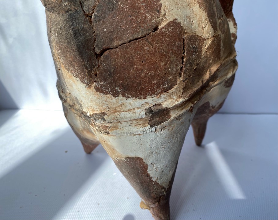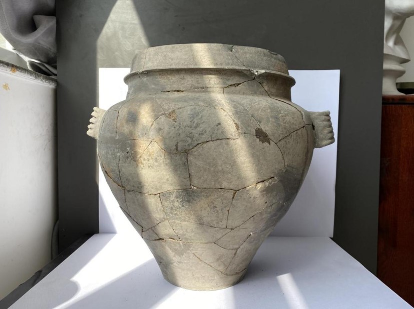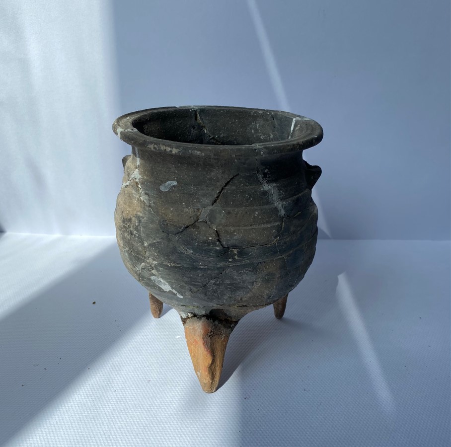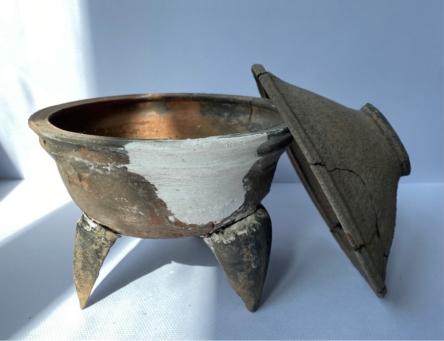 创作说明:对已损陶器进行文物修复,进而更好的展现陶器自身赋有的价值。陶器的修复主要包括清除沉积物污垢,陶器清洗,碎片预拼接,粘接,补全,以及封户等工序。修复材料及工具主要包括蒸馏水、乙醇、脱脂棉、纸胶带、手术刀、B72、丙酮等。陶器的粘接是将分组拼接成的残片再次组合拼接成整器的过程。陶器的补全遵循文物修复的兼容性原则。陶器与石膏相似相容,因此选用石膏进行补配,调配时往石膏中加入乳胶是为了增加石膏的的粘合度。给后期打磨留有一定的加工余地,待石膏固化后,将其打磨光滑。