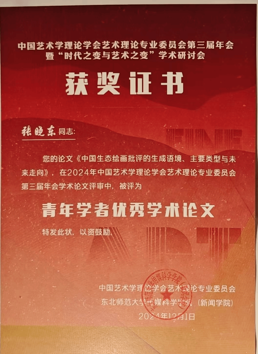 本次研讨会以“时代之变与艺术之变”为主题,旨在总结改革开放以来尤其是新时代全面深化改革所带来的社会历史巨变及文化艺术的快速发展、深刻变化,多维立体深入探讨艺术与时代的深刻内在关联,推动艺术理论的发展与进步。会议设有主旨论坛与青年论坛,与会嘉宾围绕“艺术与时代的变奏”“新时期改革开放与艺术发展变革”“艺术变革与传承弘扬优秀传统文化”“艺术媒介、科技手段、艺术体制与艺术发展”等议题展开深入研讨。我院张晓东副教授以《中国生态绘画批评的生成语境、主要类型与未来走向》为题在青年论坛发言,从生态文明时代的到来、中国生态美学的发生发展、西方生态学理论资源的引入等方面分析了中国生态绘画批评的生成语境,归纳概括了中国生态绘画批评的三种主要类型,指出了中国生态绘画批评的成绩、不足与未来方向。该论文获评2024年中国艺术学理论学会艺术理论专业委员会第三届年会“青年学者优秀学术论文”。